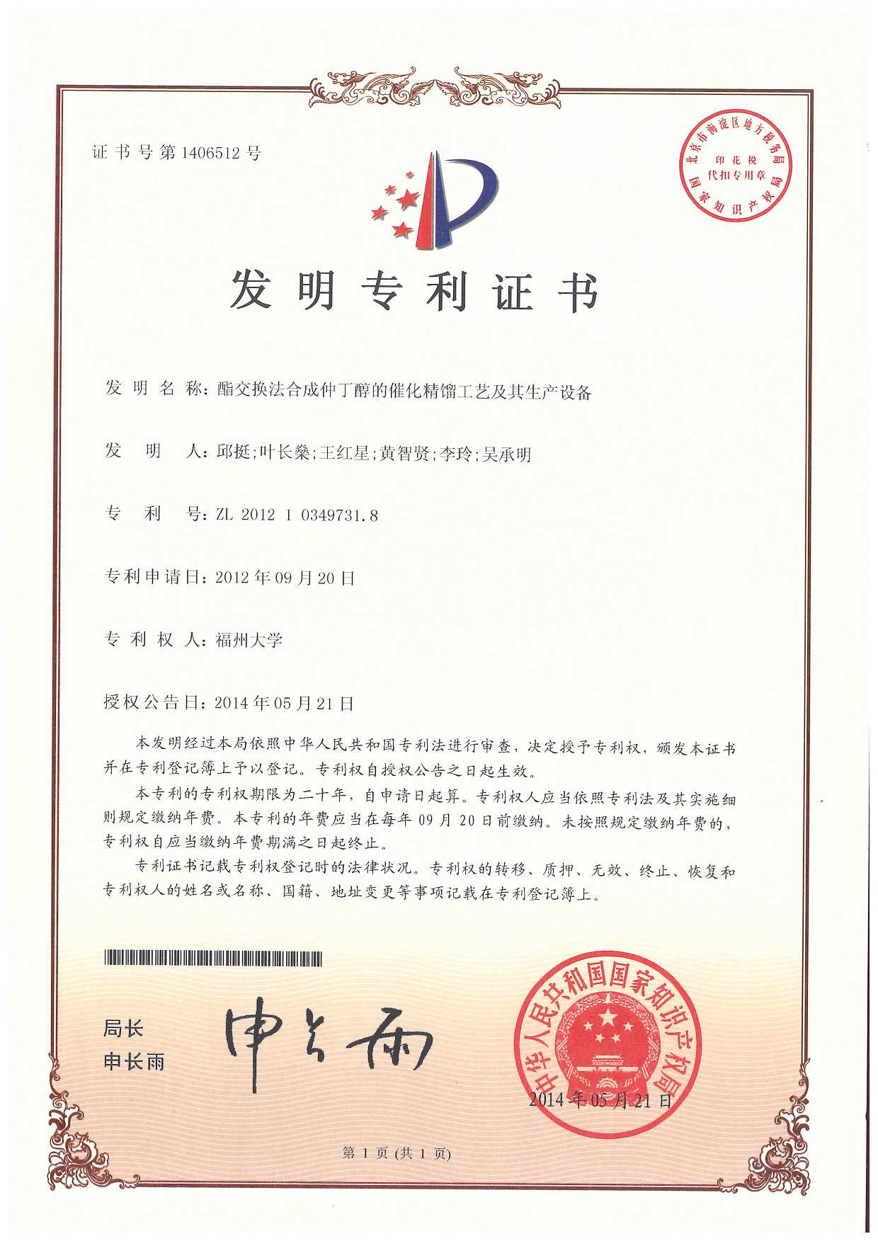 【ZL201210349731.8】 酯交换法合成仲丁醇的催化精馏工艺及其生产设备(发明专利)