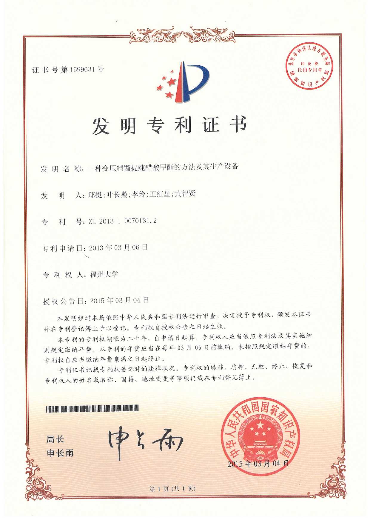 【ZL201310070131.2】 一种变压精馏提纯醋酸甲酯的方法及其生产设备(发明专利)