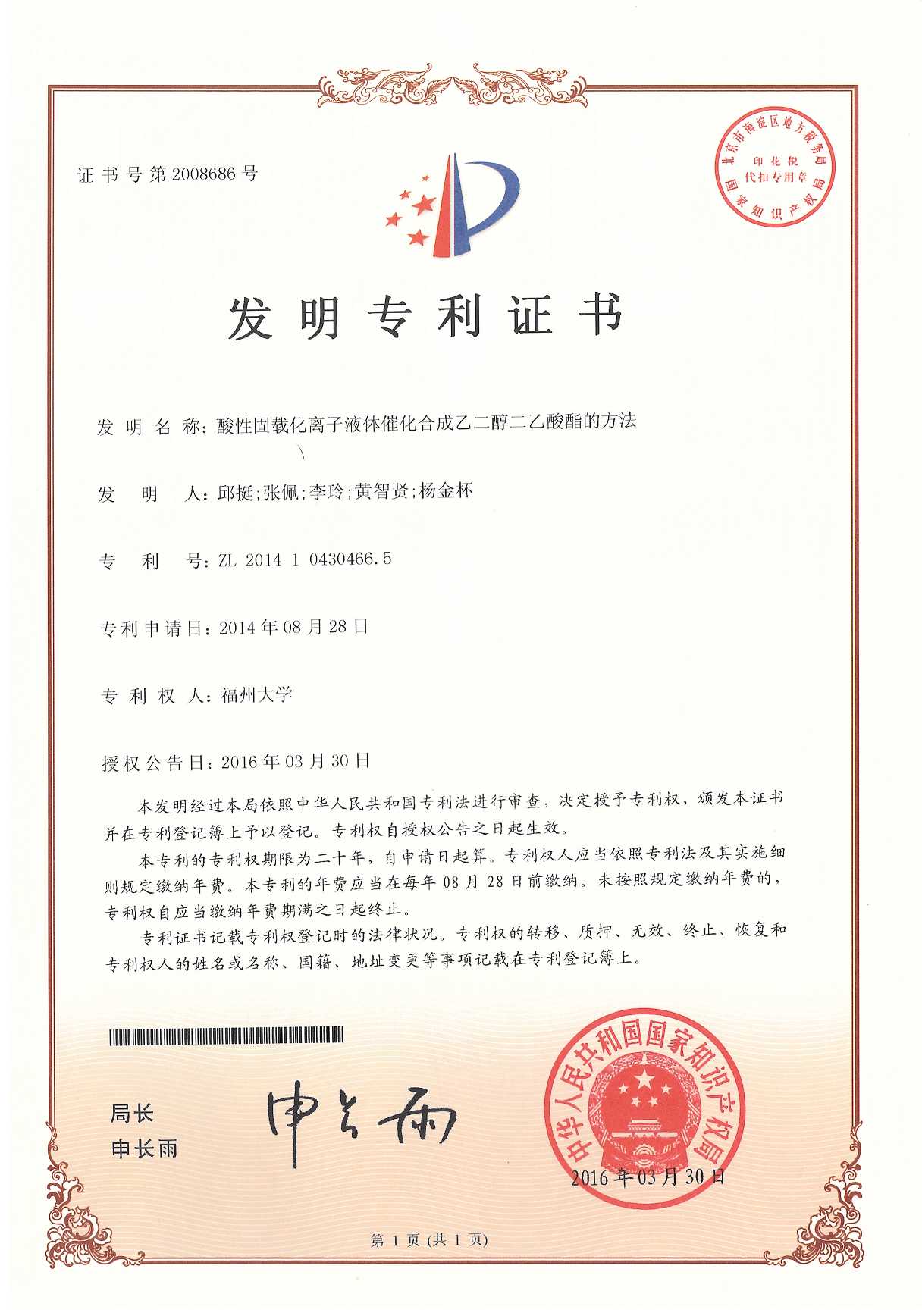 【ZL201410430466.5】 酸性固载化离子液体催化合成乙二醇二乙酸酯的方法(发明专利)