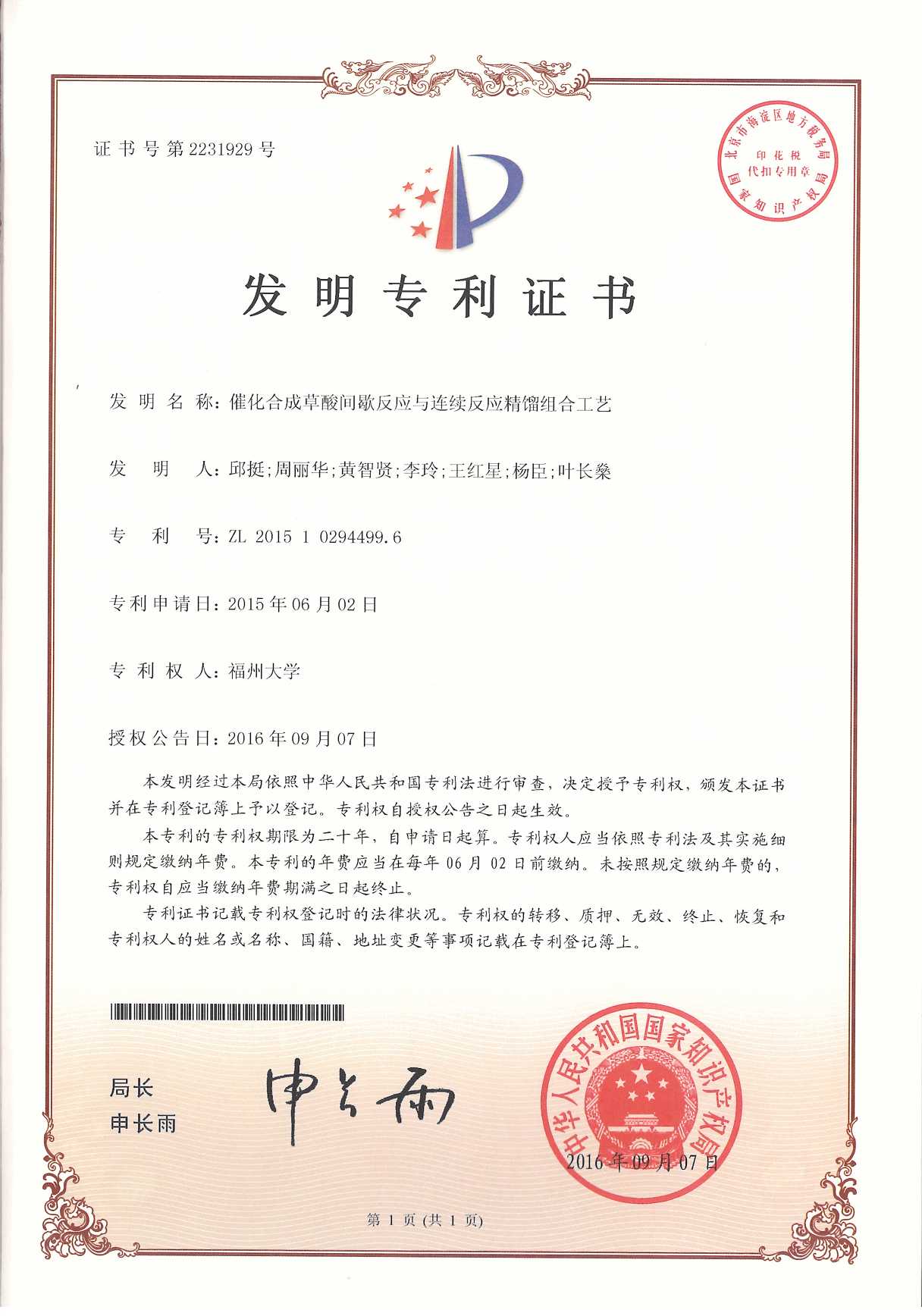 【ZL201510294499.6】 催化合成草酸间歇反应与连续反应精馏组合工艺(发明专利)