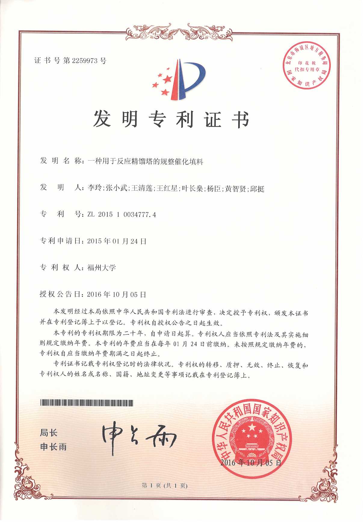 【ZL201510034777.4】 一种用于反应精馏塔的规整催化填料(发明专利)