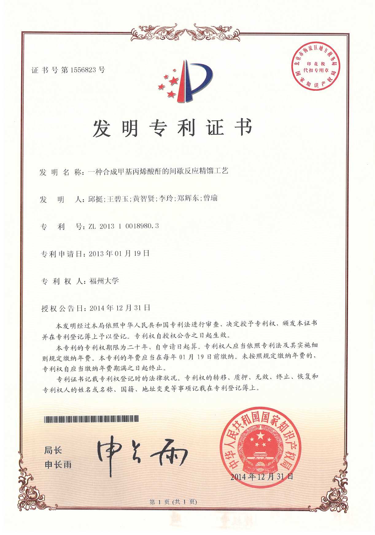 【ZL201310018980.3】 一种合成甲基丙烯酸酐的间歇反应精馏工艺(发明专利)