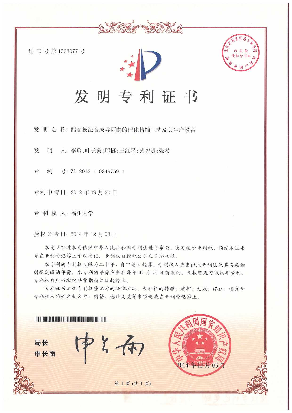 【ZL201210349759.1】 酯交换法合成异丙醇的催化精馏工艺及其生产设备(发明专利)