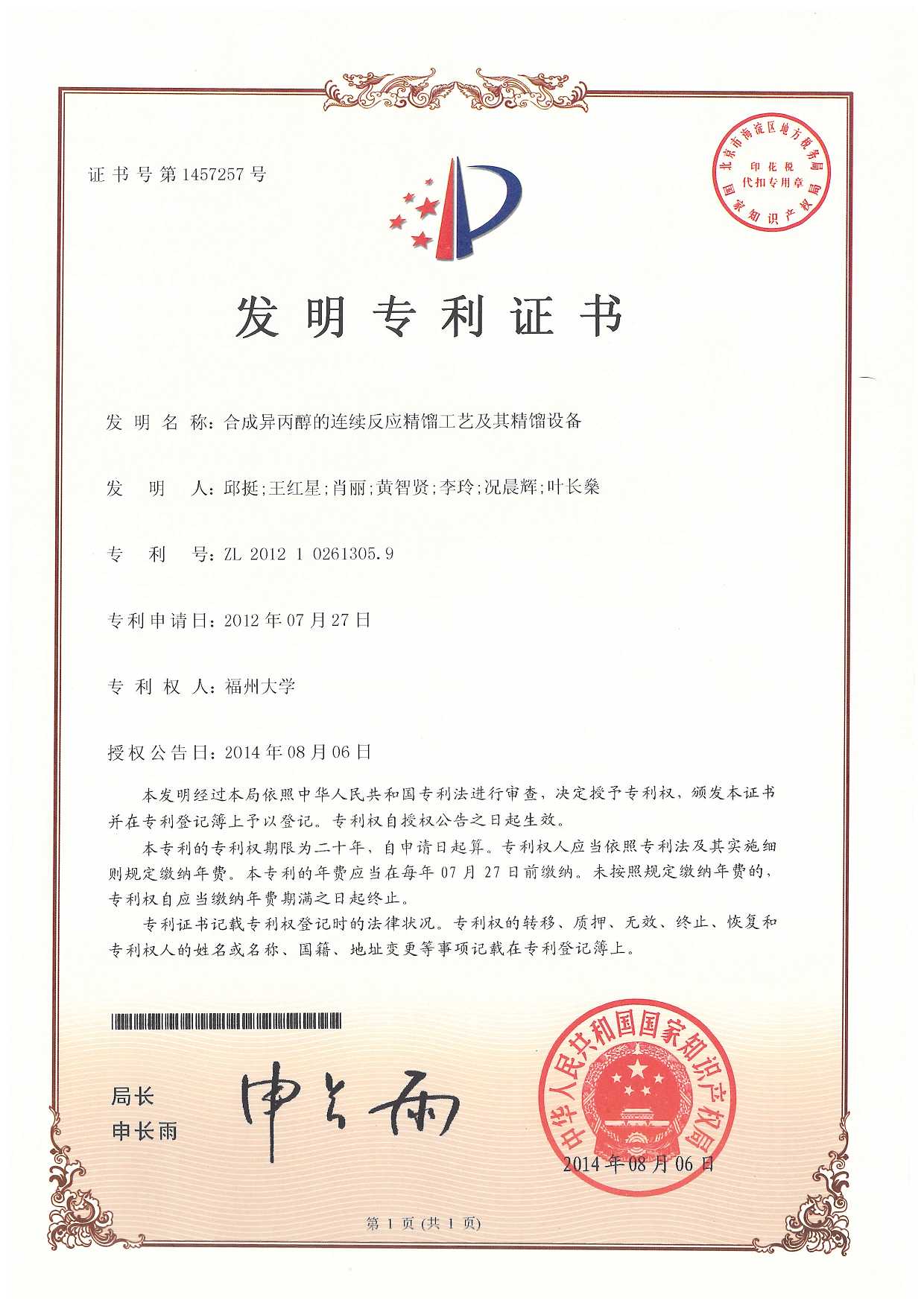 【ZL201210261305.9】 合成异丙醇的连续反应精馏工艺及其精馏设备(发明专利)
